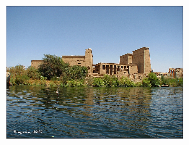 據說原本Philae Temple位於的Bigeh小島上, 正是Osiris被埋葬並復活的地方. 但是因為Aswan大壩的關係, Bigeh小島已經完全淹沒在水裡. 為了拯救這目前保存最好的Ptolemy神殿, 1960年UNESCO開始把這神殿切割成數萬塊, 搬移到另一個較高的小島Agilkia重新組裝, 一直到1980年才完成. 所以參觀時需要到Nubian的一個小村莊旁, 搭著當地人的船隻到水壩中央, 也就是Philae Temple位於的Agilkia小島上.