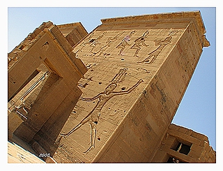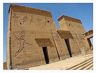 [Philae Temple的正面, 牆壁上有豐富的埃及人像畫與象形文字]