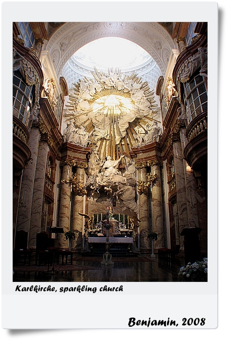 Karlskirche內部明顯的顏色對比, 以及壁畫或是柱畫的異國風味, 都使這它在華麗中展現奢華的味道.
