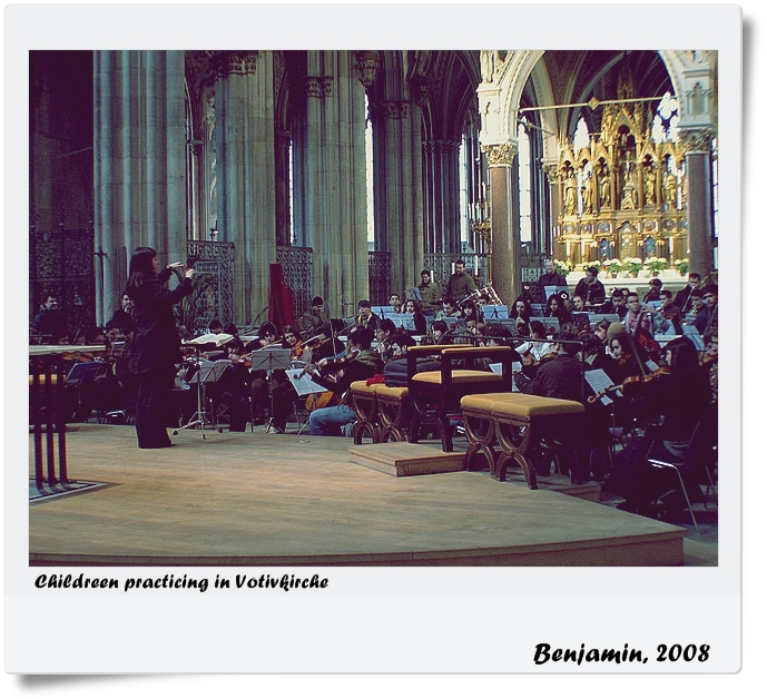 在教堂內發現有一群小朋友正在練習, 而維也納不虧是音樂之都, 講台上一堆可能路過這裡的自由音樂家, 協助老師糾正小朋友的錯誤...