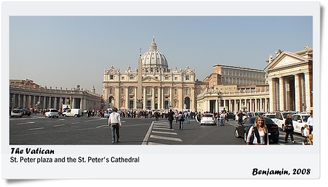 Vatican也叫做Holy See, 是世界上人口最少, 國土最小的國家. 它位於義大利首都羅馬內, 但其實真正算梵帝岡只有聖彼得教堂, 梵帝岡博物館區域, 以及聖彼得廣場. 梵帝岡的領袖當然就是教宗, 現任教宗是第256屆的天主教教廷教宗Benedict XVI.