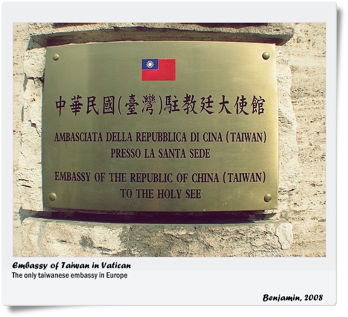 另外直得一提的是, 梵蒂岡雖然身為中立國, 但它是目前歐洲唯一承認中華民國, 也就是台灣的國家, 所以在梵蒂岡通往聖天使城的道路上, 有台灣的大使館. 其時教廷一直對中國政府對宗教的干涉感到很不滿, 例如天主教地區代表的指派, 對教廷來說這都該由教廷政府來執行, 而不是像中國政府認為的由中國共產黨來執行. 但是, 最近教廷要與台灣斷交的消息也不斷傳出, 台灣與梵蒂岡的外交關係可以說已經非常脆弱.