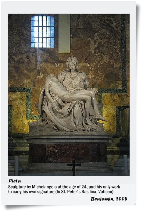 米克蘭基羅是個義大利文藝復興的代表性人物, 作品非常多並散佈在義大利各地, 所以在接下來義大利遊記裡會不斷提到他. 他是個天才型人物, 很早就開始展現他的藝術天份. 聖彼得大教堂裡的"聖殤"(Pieta), 就是米克蘭基羅23歲時的創作, 也是唯一他有簽上自己名字的作品. 這個大理石雕刻表達的是聖母抱著斷氣的耶穌, 並透過她的表情與肢體呈現出她的悲傷與痛苦, 是教堂裡非常受到大家矚目的一個藝術品.