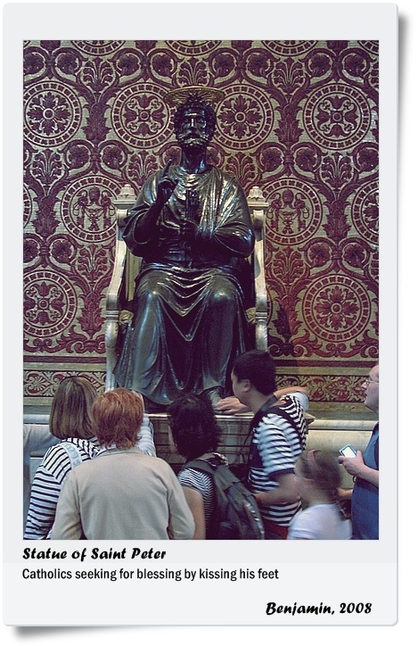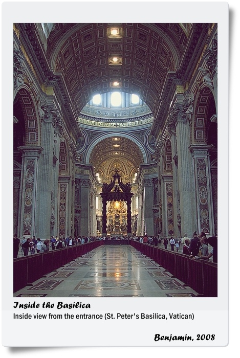 聖彼德教堂裡永遠都是爆滿觀光客, 有些人是來參觀(就像我), 而有些人是來朝聖. 在教堂的地下室是歷代教宗的墓, 裡面禁止拍照. 繞了一圈後發現許多人甚至會跪在上任教宗約翰保祿二世(J. Paul II)墓前默哀非長久的一段時間, 他們虔誠之心真是讓我感到非常敬佩.