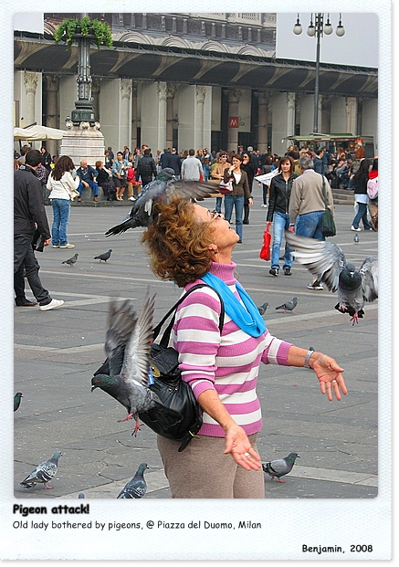 由於廣場的鴿子非常多, 所以難免會有許多人拿著飼料要騙觀光客. 如果讓他們灑一把飼料在你手中, 就會吸引許多鴿子停在你手上, 但是代價可能會是好幾歐, 或是像照片上的這位老太太, 被鴿子圍攻. 歐洲的鴿子可都囂張的勒...