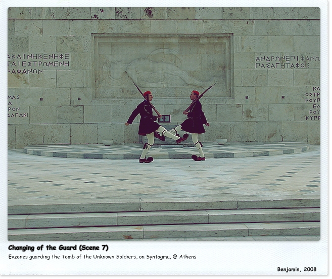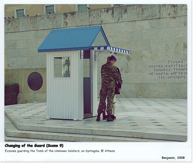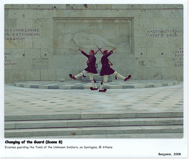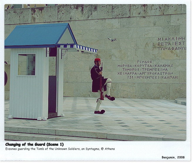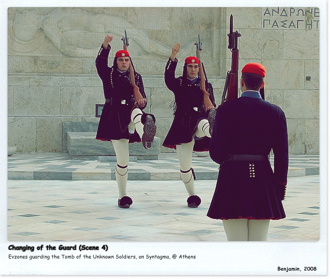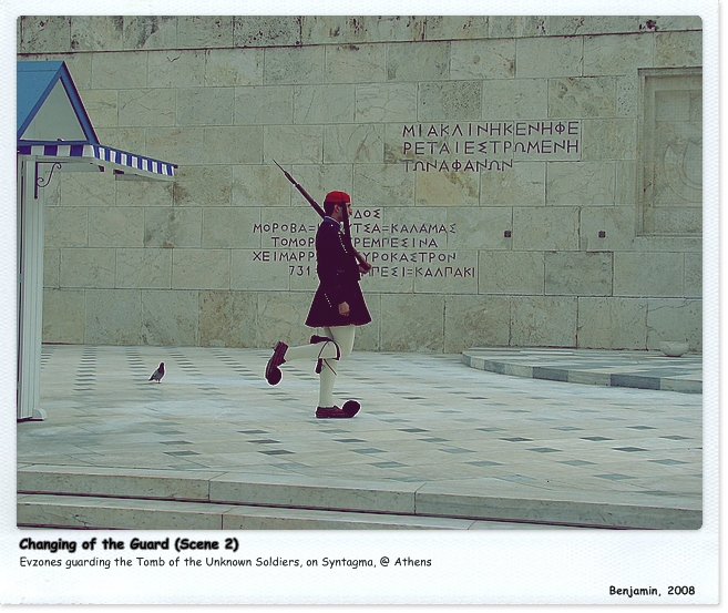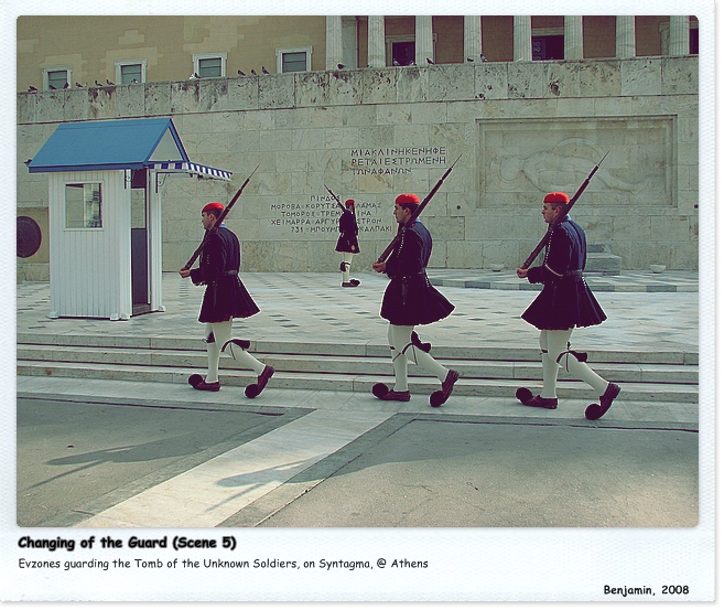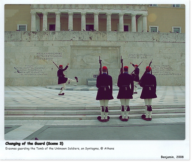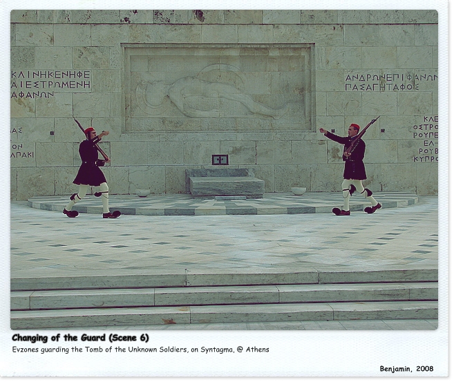 在雅典(Athens)裡, 位於Syntagma區的Tomb of the Unknown Soldier紀念著在二次大戰中死去卻無法被認出身份的希臘士兵. 二次大戰希臘扮演著悲慘的腳色, 希特勒(Hitler)將此地劃分給穆索里尼(Mussolini), 由義大利軍隊佔領. 但是義大利軍隊戰力是爛到出名的, 加上希臘人不停的反抗與Sabotage, 到最後逼的德軍自己出馬佔領此地, 也讓更多的希臘人因此喪命.