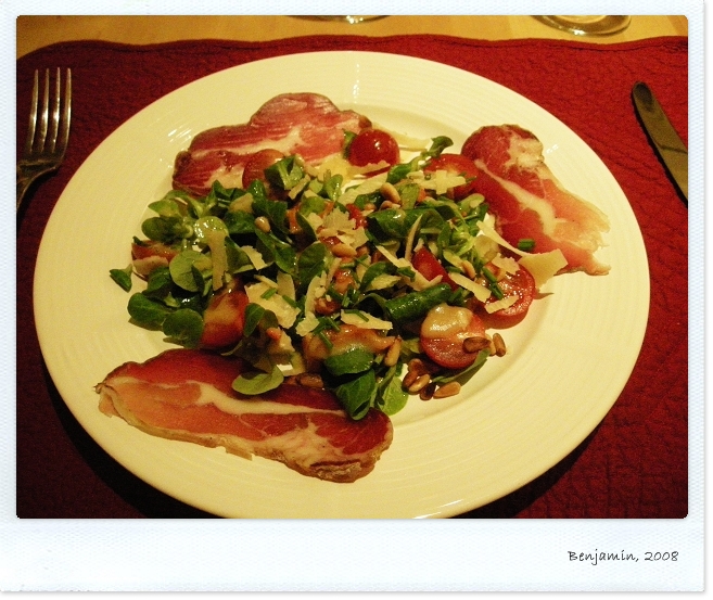 前菜: 好吃的醃肉與生菜.