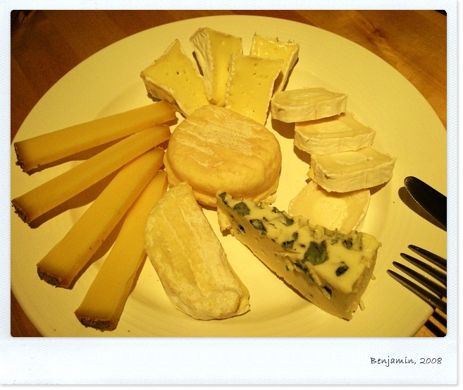 Cheese: 法國人習慣在飯後來點起士. 這也是Guillaume最得意的部份, 他說每當他看到旅客吃下Cheese的表情他就感到很爽... 通常最不被接受的有blue cheese(發霉的)與山羊cheese, 它們那種味道非常可怕, 吃過的人永遠不會忘記.