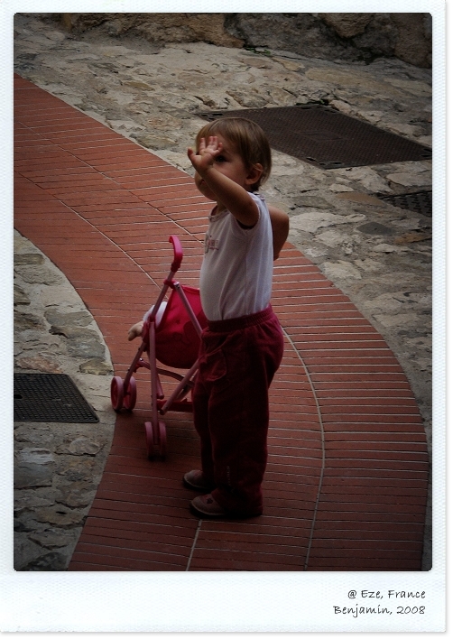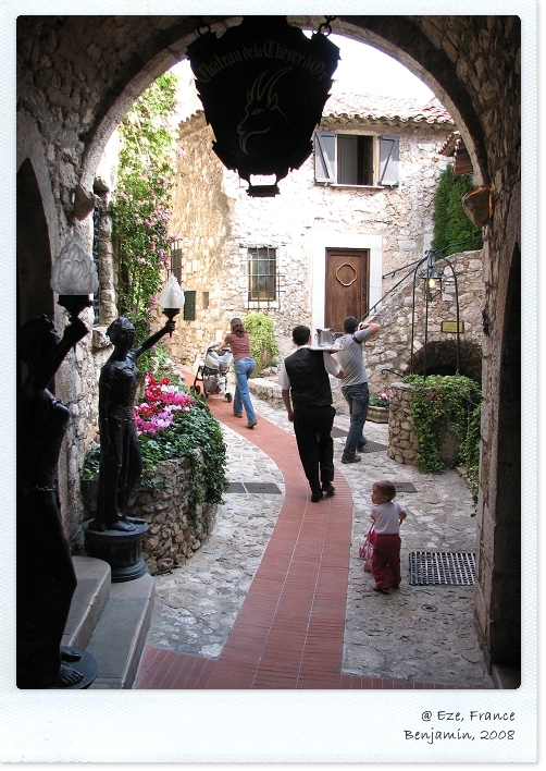 在參觀艾茲村的一個家庭觀光客, 還有可愛的小朋友跟石像說掰掰.