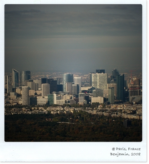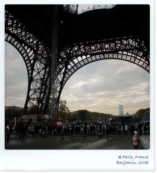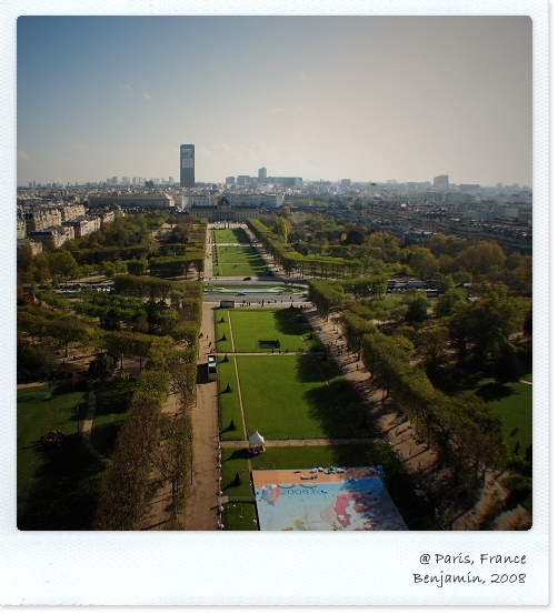 為了上去鐵塔, 都得在電梯前排隊排超久的, 這裡也是許多扒手與小偷猖狂的地方. 不過我到覺得, 相較起來, 鐵塔下方的販賣部更像是土匪, 一杯熱可可要4歐, 而且喝起來就像是有巧克力味道的熱開水, 真是搶劫. 從鐵塔往戰神廣場望過去可以看的到巴黎另一個高大的建築物: La Tour Montparnasse.