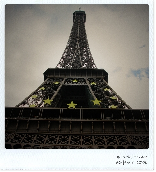 那天不知道排了多久終於可以搭電梯上去, 有三種價錢, 上到最頂端的價錢是12歐. 從艾菲爾鐵塔的下方往上看, 鐵塔上有象徵歐盟的12顆星當裝飾.