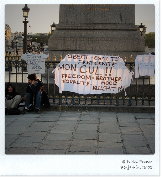 在香榭大到通往凱旋門的路口, 有一群學生挑戰著法國著名的建國口號: Liberte, Egalite, Fraternite. Mon cul的意思就是my ass, 念法是"猛ㄎㄩˋ", 這是很適合初學者學的一句法語!